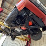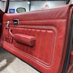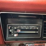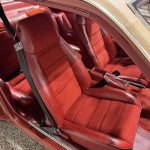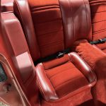 The interior is trimmed in matching Dark Firethorn cloth on the front and rear bucket seats, coordinated with dashboard, door panels, carpeting, and woodgrain accents. A center console, air conditioning, aftermarket digital stereo, and tilting steering column complete the cabin.